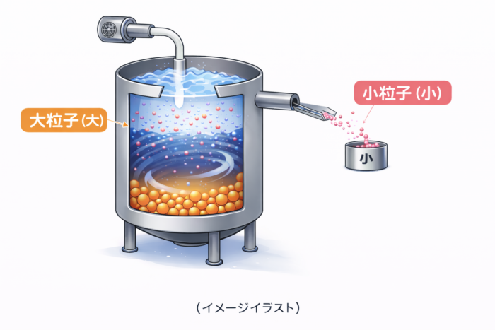 分級分離について 液体中に分散している固体物質を、粒子径の大きなグループと小さなグループに分けることを分級といいます。 遠心分離機を用いて、遠心力によって粒子に作用する力を与え、流量などの条件を調整しながら、基準となる粒子径を狙って分離する方法を分級分離と呼びます。 粒子の大きさを揃えることで分散状態が均一化され、その特性を活かして、工業的には性能や品質の向上を図ることができます。これにより、製品としての付加価値を高めることが可能になります。 。 <過去事例> ・インク材料の品質向上